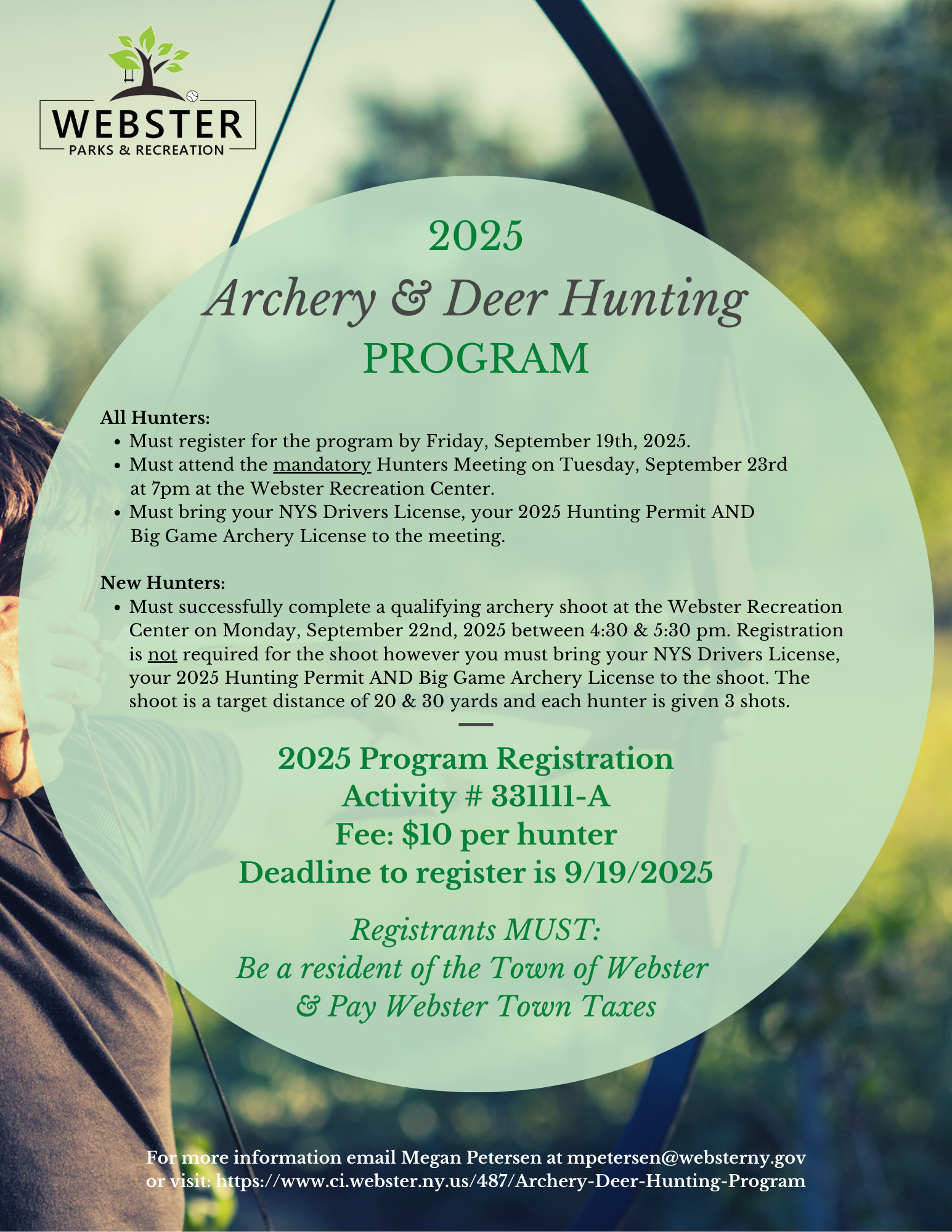 Beginning October 1, the following Town Parks will be open for the ARCHERY deer hunting program; Finn Park, Whiting Road, Gosnell Preserve and Four Mile Creek Preserve. Archery hunting is allowed for those enrolled in the Webster Parks and Recreation program and have attended the mandatory safety meeting. All hunters have passed a shooting proficiency test. Hunting is permitted daily between the following hours; Sunrise - 10:00AM and 3:00pm - Sunset (adjusts to 2:00PM at daylight savings time). Crossbows are not allowed to be used on Town property.