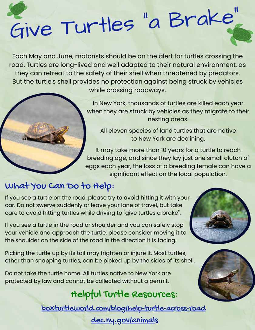 In New York State, thousands of turtles are killed each year as a result of being struck by vehicles as they migrate to their nesting areas. All eleven species of land turtles that are native to New York State are declining.